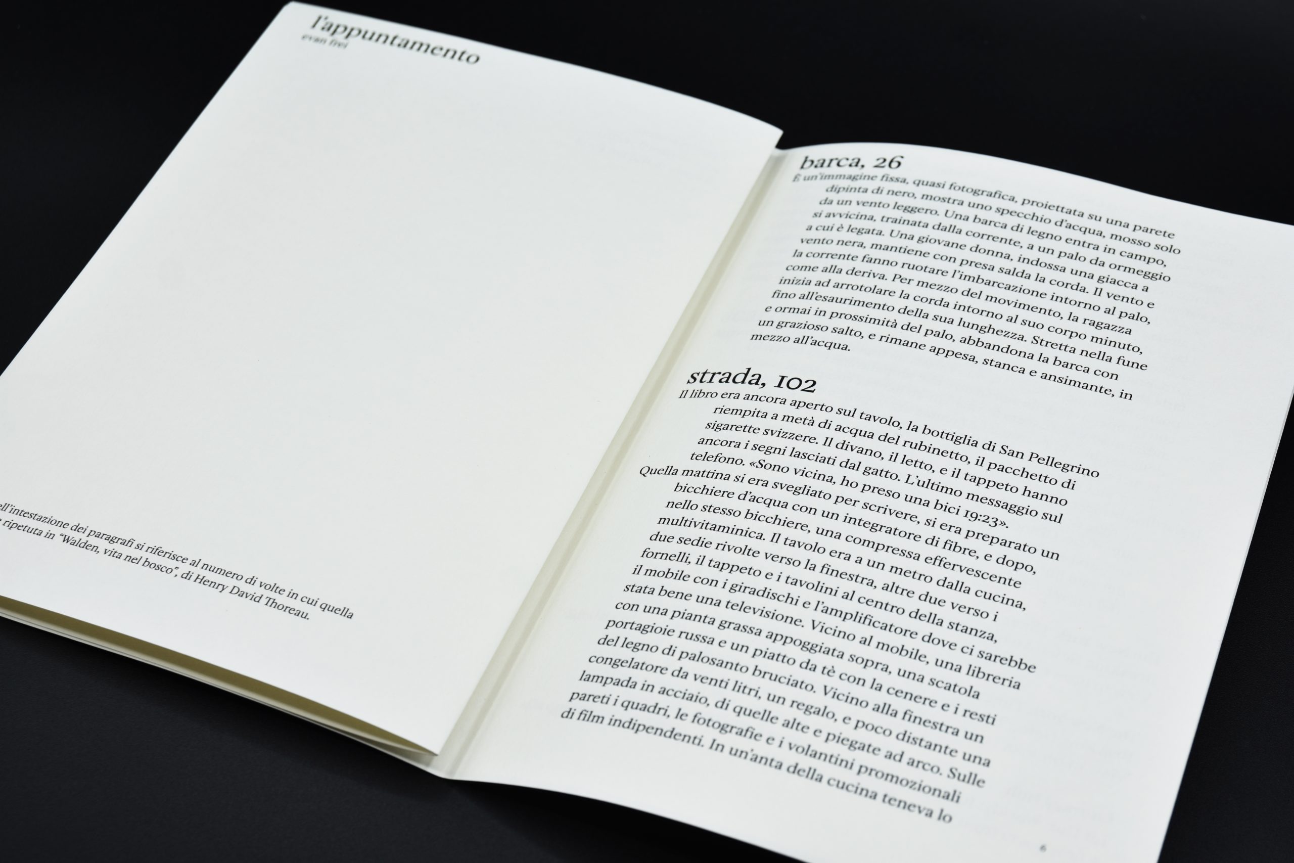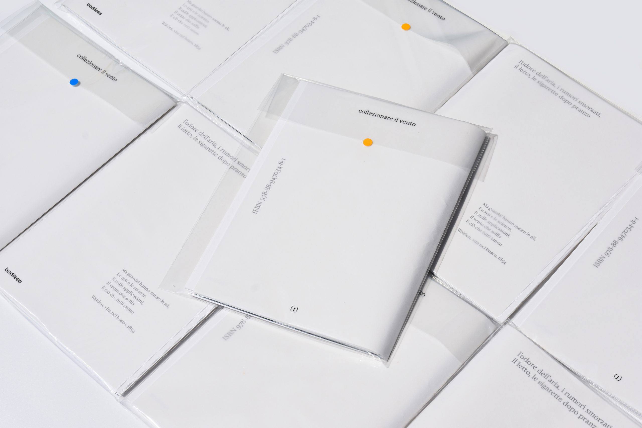 Collezionare il vento (collecting the wind) is an exploration of the poetic concept of wind through photography and fiction. The book is divided in two volumes, and each volume is divided into three sections: a collection of analog photographic printing experiments made in the dark room, an auto fiction short text (in Italian), and a glossary with every paragraph where the word “wind” is mentioned in Henry David Thoreau’s Walden.