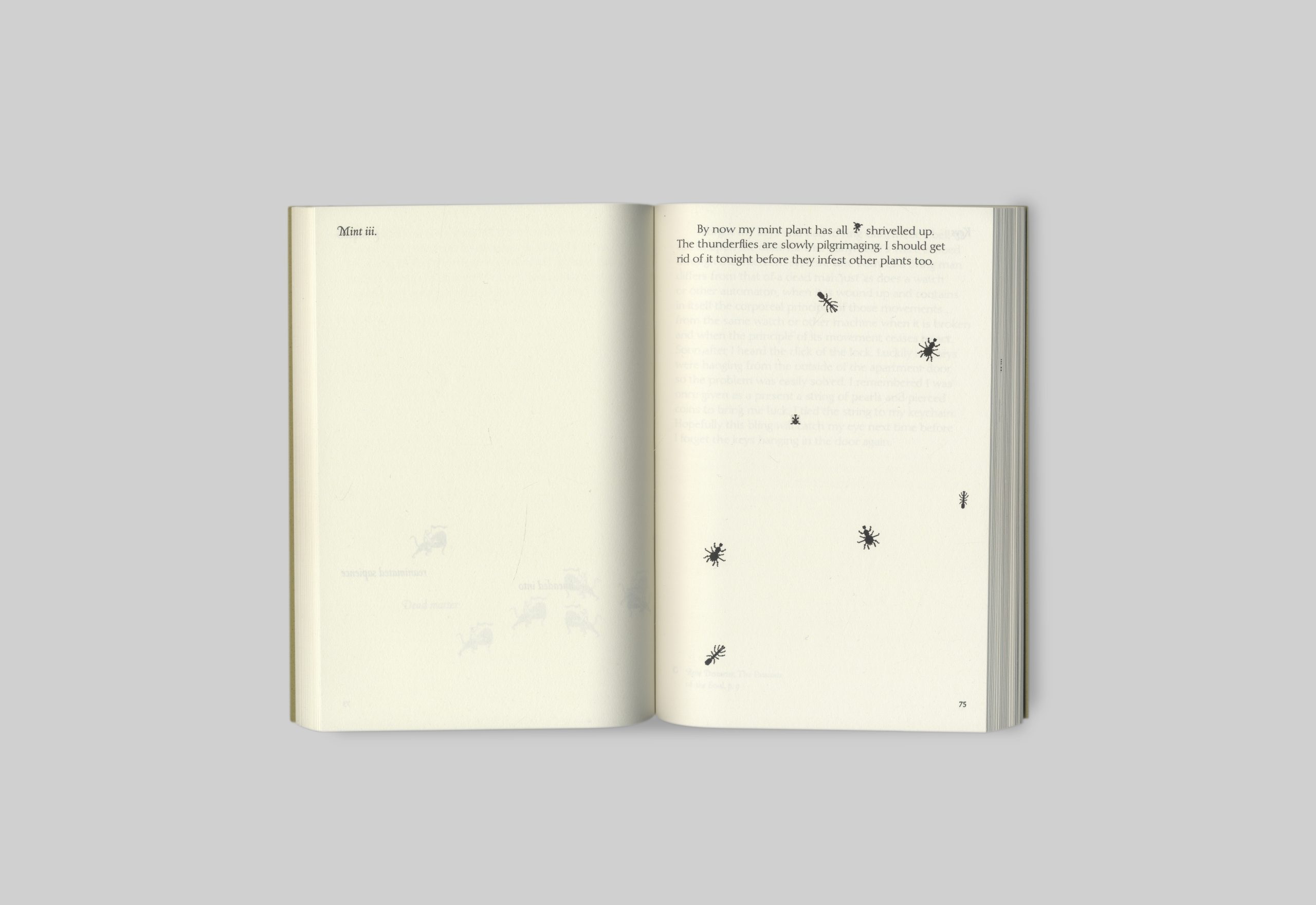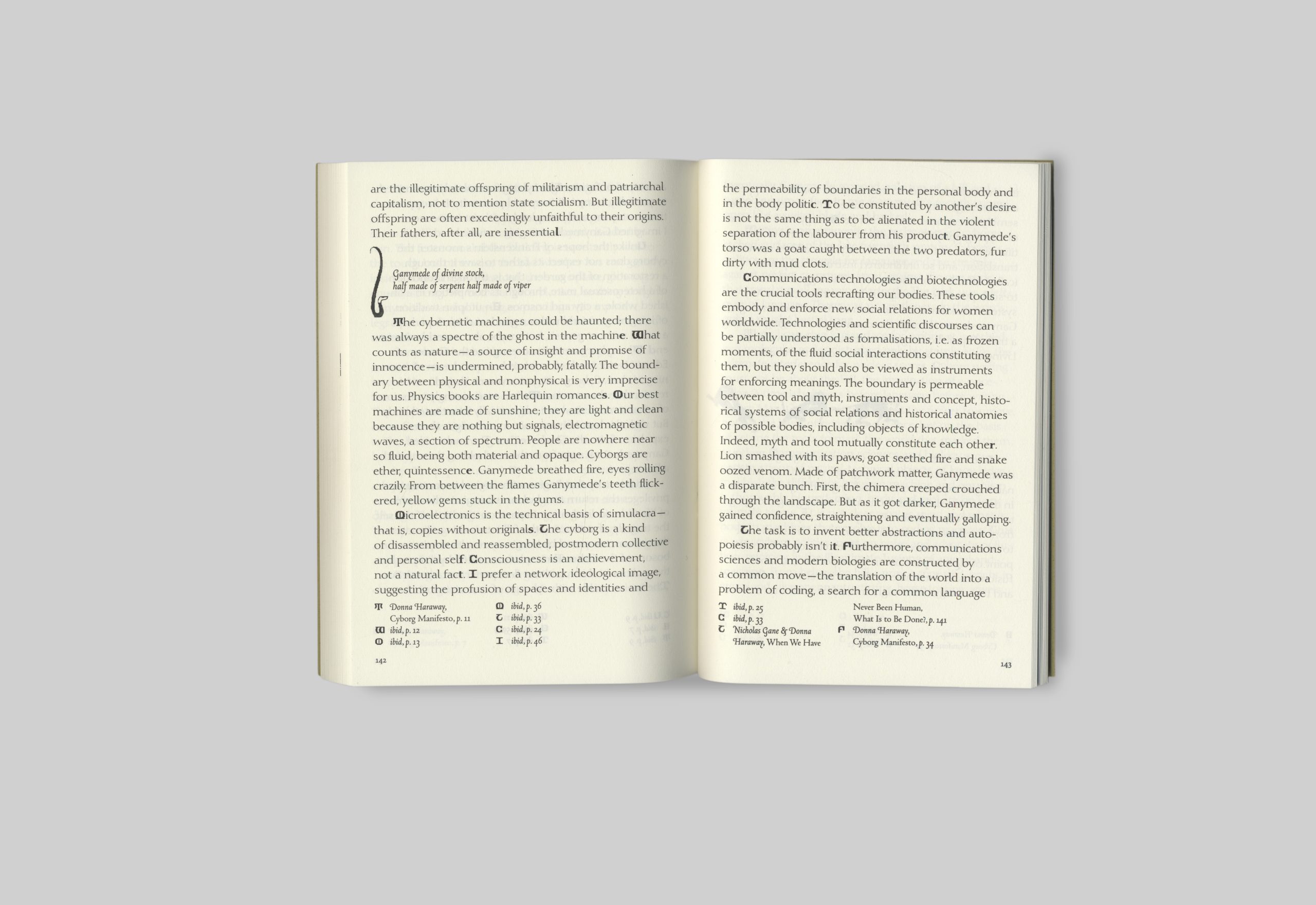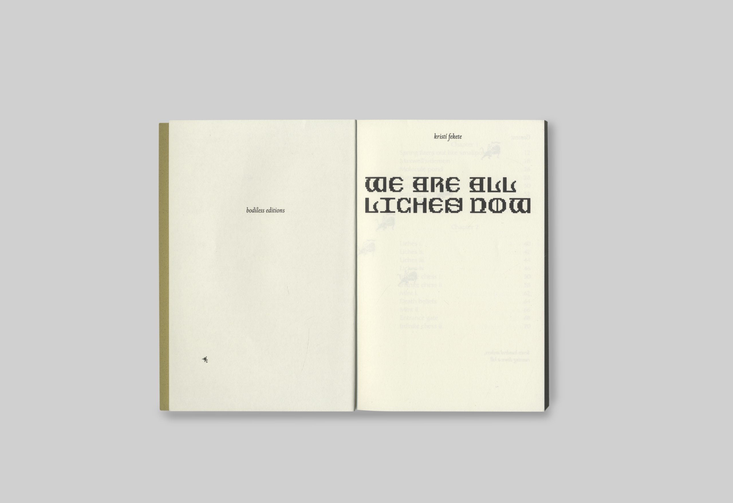A fairytale science fiction that doubles as a fabulative analysis of how technology shapes one’s identity. Patchworked together from text by various authors (such as Donna Haraway, Katherine Hayles, Reza Negarestani, Shirley Jackson, Ursula K. Le Guin,…) used as dialogue, and own narration. Pixelated illustrations are used in a similar pattern-like manner, giving the book an anachronistic atmosphere. The story passes through digital and mythological landscapes as the main character, Ganymede, gets digitalized into a lich: an intellect-driven undead creature seeking eternal life.